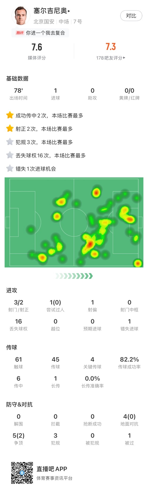 4月19日宣 中超第8轮,北京国安对阵山东泰山,塞尔吉尼奥首发出战78分钟打进一球,获评7.6分。