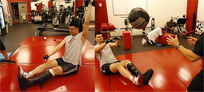 术后三周,姚明便重返健身房,用特制护具完成坐姿投篮;