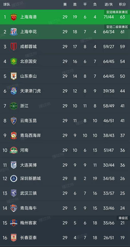 本赛季争冠的格局还是上海双雄,海港3-0战胜浙江队之后,积分上涨到63分稳居第一,申花1-0小胜深圳新鹏城,积分上涨到61分,两支球队之间只相差2分,海港掌握冲击三连冠主动权。最后一轮,海港的对手是大连英博,只要能够拿到分数,就能稳稳收获冠军。申花最后一轮的对手是天津津门虎,除了自己要全取三分,还希望大连英博能够爆冷阻击海港。申花队史还从来都没有拿过中超冠军,上赛季1分之差屈居亚军,这个赛季他们还能创造奇迹吗?