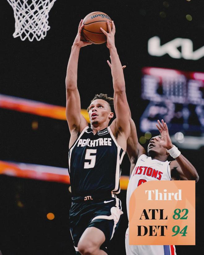 为了提升防守强度,活塞把坎宁安换下场休息了3分多钟。效果立竿见影,老鹰连续出现3次失误,杜伦和奥萨尔送出大帽,分差重新回到两位数。末节最后3分钟,坎宁安重新登场。最后1分半,沃克率老鹰追到2分,坎宁安连得4分杀死比赛。