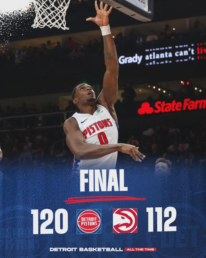 坎宁安25分6板10助2断、杜伦24分8板3助2断!今天坎宁安末节9分,本赛季末节一共轰下123分,高居联盟第一!活塞开季13胜2负,追平2005-06赛季的最佳开局。约翰逊25分8板9助3断、沃克24分3板3助、奥孔武21分3助3帽。