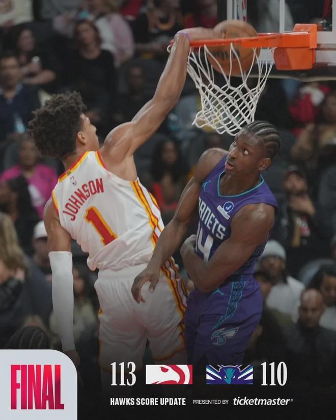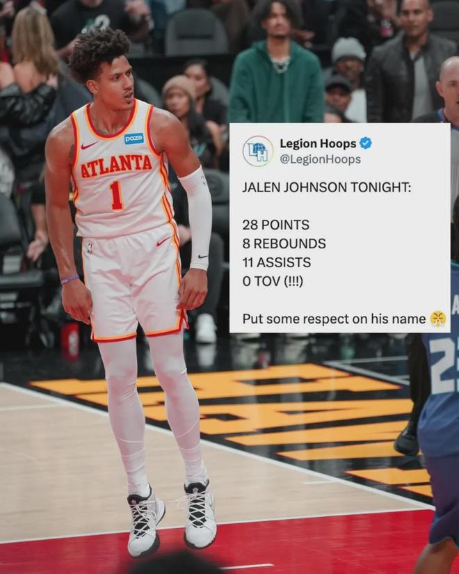 上一场对阵黄蜂,杰伦-约翰逊砍下28分8篮板11助攻0失误,这是老鹰队史首次有球员单场至少25分5篮板10助攻0失误。
