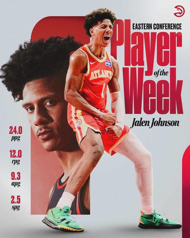 杰伦-约翰逊是老鹰近期状态如此出色的最大功臣,这位21年的20号秀生涯第三年从场均5+4的替补成长为16+9+4的稳定首发,近两年仍然在不断成长。