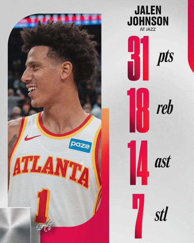 23岁的杰伦-约翰逊也成为1999年以来单场至少拿到25分10助攻0失误最年轻的前锋球员。