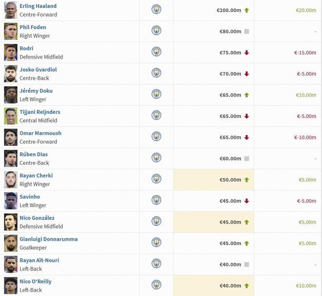 北京时间12月9日,德转公布新一期英超球员身价。曼城俱乐部方面,哈兰德身价上涨2000万欧,以2亿欧的身价位列英超球员第一。而饱受伤病困扰的罗德里身价由9000万欧下跌至7500万欧。