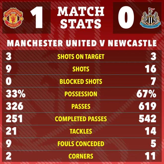 达洛浪费了另一个提前确保胜局的良机,他接到利马的长传,但一脚挑射高出横梁之外。幸运的是,这不妨碍曼联最终赢球,因为如前所述,纽卡斯尔的射门比红魔更烂。