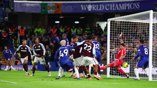 第37分钟,里斯·詹姆斯开出角球,维拉门前一片混乱,佩德罗甚至没有注意到皮球,皮球砸在他的小腿上,弹进球门。