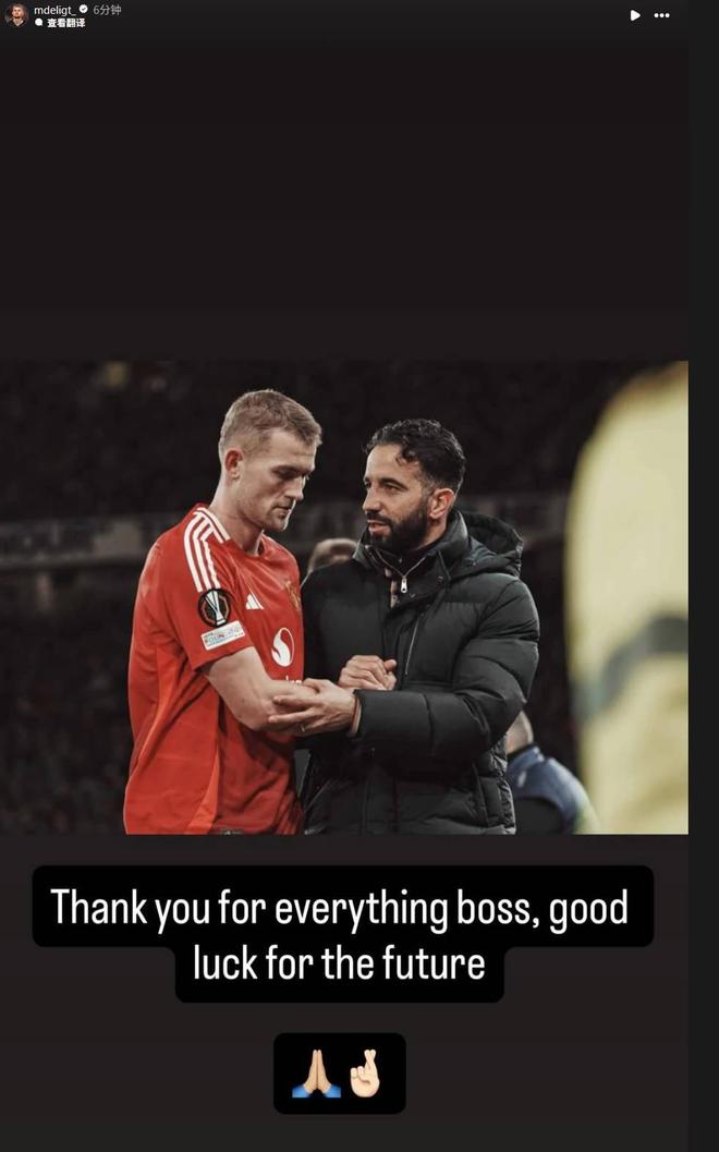 德利赫特晒出了上赛季欧联杯时与阿莫林的合照,并配文:“感谢你所做的一切,老大,祝你未来一切顺利。”