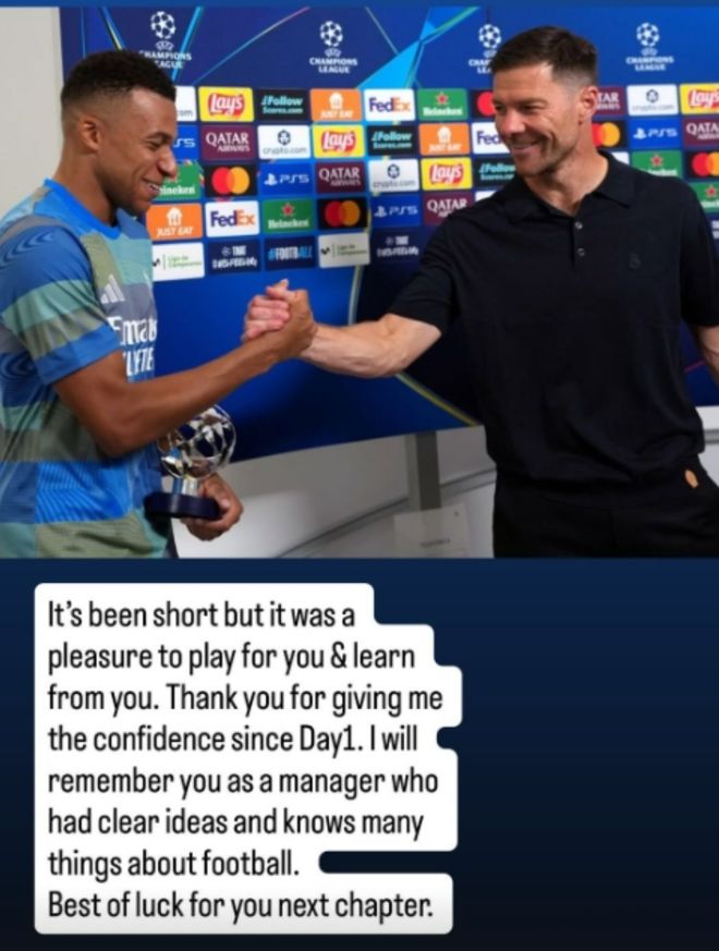 01月13报道 皇马官宣阿隆索下课,姆巴佩在社媒发表动态与阿隆索告别。